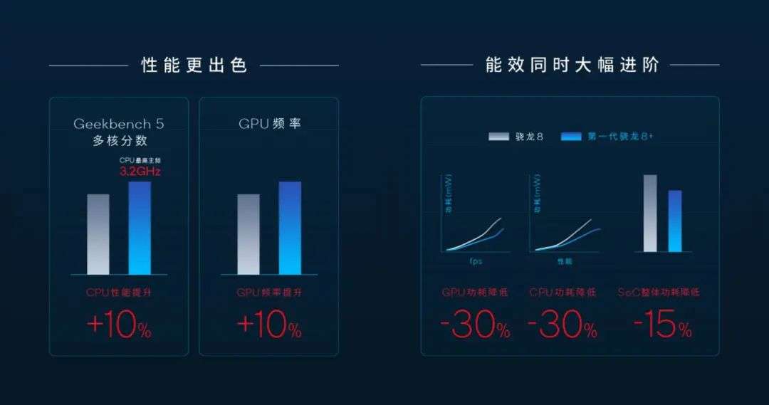 骁龙8+移动平台于2022年5月20日正式发布,延续了去年12月发布的骁龙8的1*Cortex-X2超大核+3*Cortex-A710大核+4*Cortex-A510小核的CPU架构,有约10%的频率提升,GPU也是Adreno 730。令人瞩目的是,骁龙8+整体功耗降低了15%,CPU和GPU则各自降低了30%。