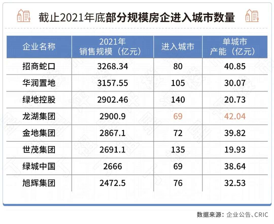 截至2021年底,龙湖进入的城市数量为69个,在同等规模的企业中偏少。与之形成对比的是,龙湖的单城市产能达到42.04亿元,在同等规模的企业中是最高的。