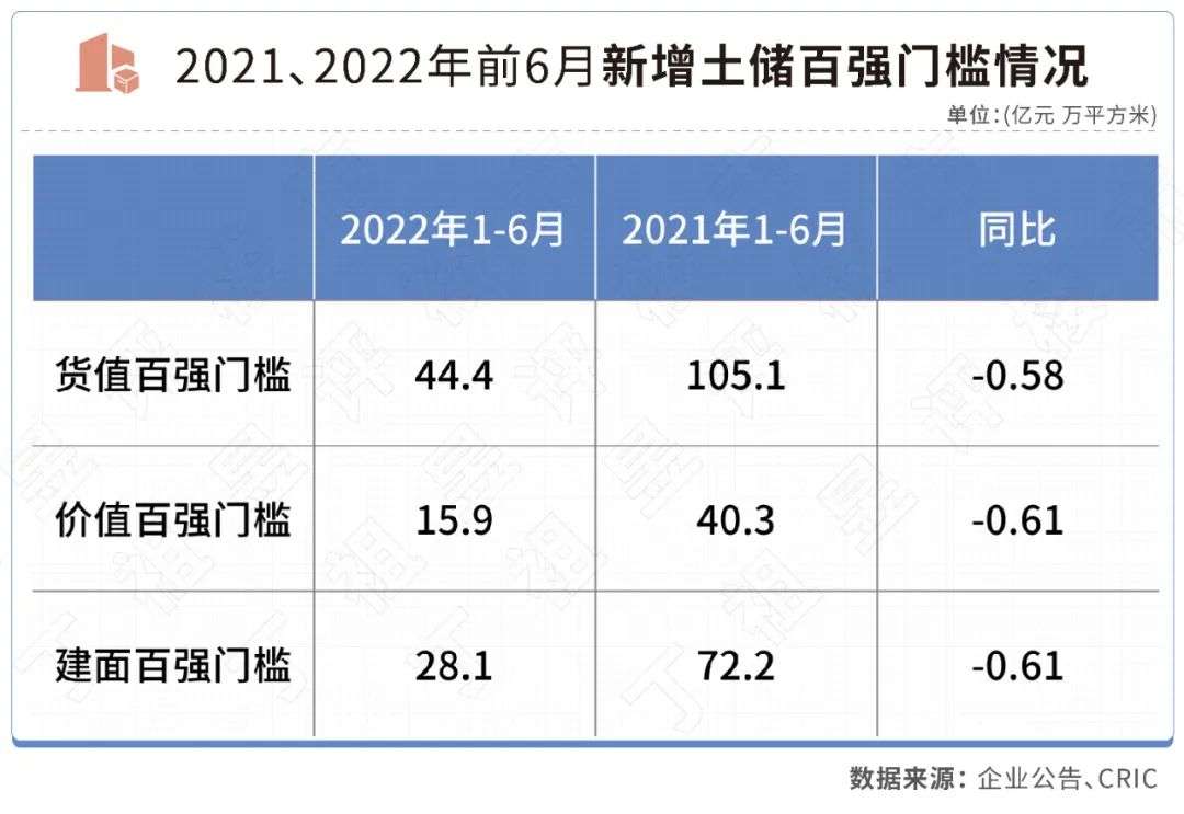 CRIC数据显示 ,2022年前6月,新增货值百强门槛44.4亿元,同比大降58%;投资金额、建面百强门槛分别为15.9亿和28.1万平方米,同比降幅61%。