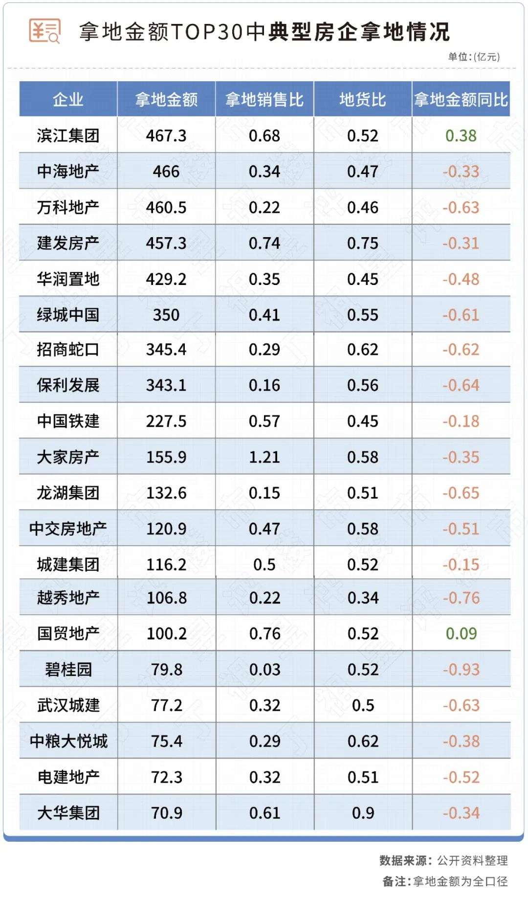 从已拿地的典型百强企业来看,除滨江等少数房企拿地金额维持正增长,万科、绿城等拿地金额同比跌幅超过60%。