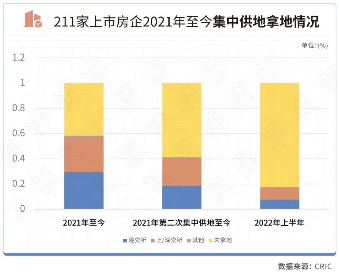 2022年上半年至今,211家上市房企尚未在22个集中供地城市拿地的占比为82.5%。绝大多数为民营上市房企。