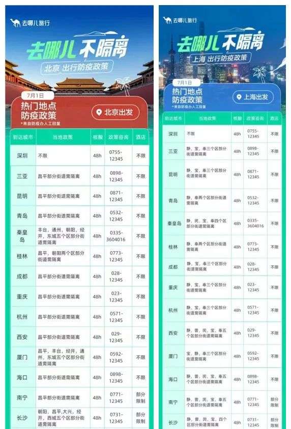 目前,为了能更方便地查询各地防疫规定,携程、去哪儿等平台纷纷推出防疫规定查询服务,去哪儿网甚至每天都要更新一个最新版本的国内重点旅游目的地的防控规定。