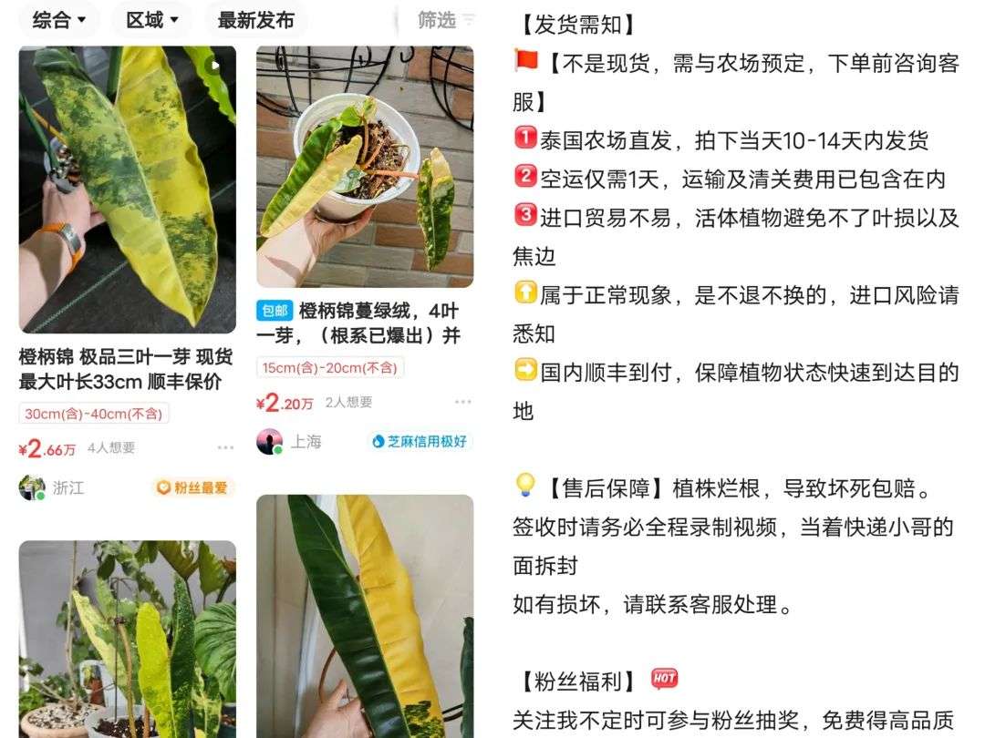 在闲鱼上搜索“热植”,可以看到销售绿色植物的卖家以云南、广州、深圳居多,销售价格从几十元到上万元不等,还有的卖家搞起了“预售”,在简介中强调非现货、需与泰国农场预定。其中一株价格两万元的橙柄锦销售页面已有上千次浏览。