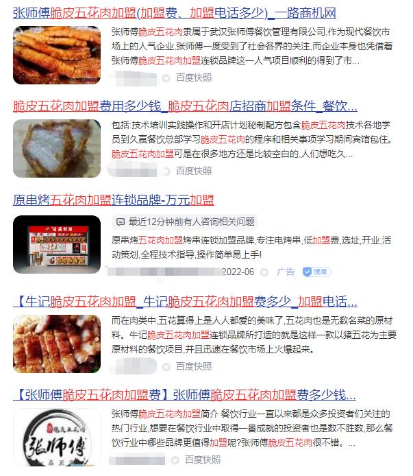 据一位业内人士透露,这些脆皮五花肉品牌大多是一些快招公司做的。我们看到,在很多店招牌上,除了“网红脆皮五花肉”几个大字外,还会附上“加盟热线”。