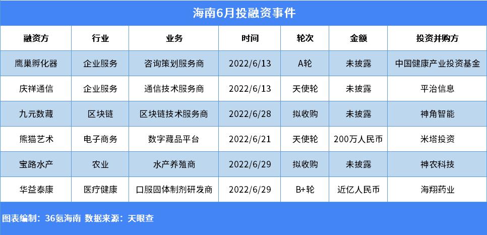 6月,36氪海南统计了海南省内发生的6起投融资交易事件,相关企业6家,其中天使轮2起:庆祥通信、熊猫艺术;A轮1起:鹰巢孵化器;B+轮一起:华益泰康;拟收购2起:九元数藏、宝路水产。涉及5大行业:企业服务、区块链、电子商务、农业、医疗健康,其中企服行业最受资本青睐。