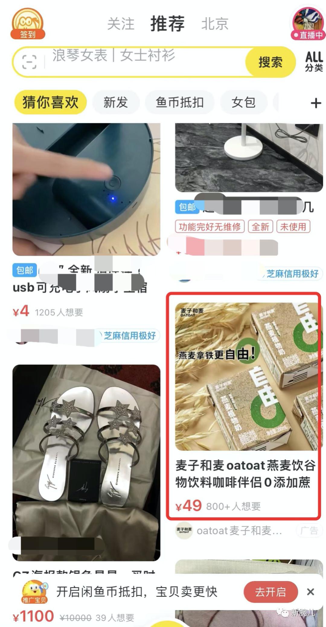 再看第三名的oatoat麦子和麦,付款人数1万+。和欧扎克不同,oatoat麦子和麦没有请明星代言,却做了大量广告投放。例如搜索过他们后,闲鱼算法会推荐oatoat麦子和麦广告。