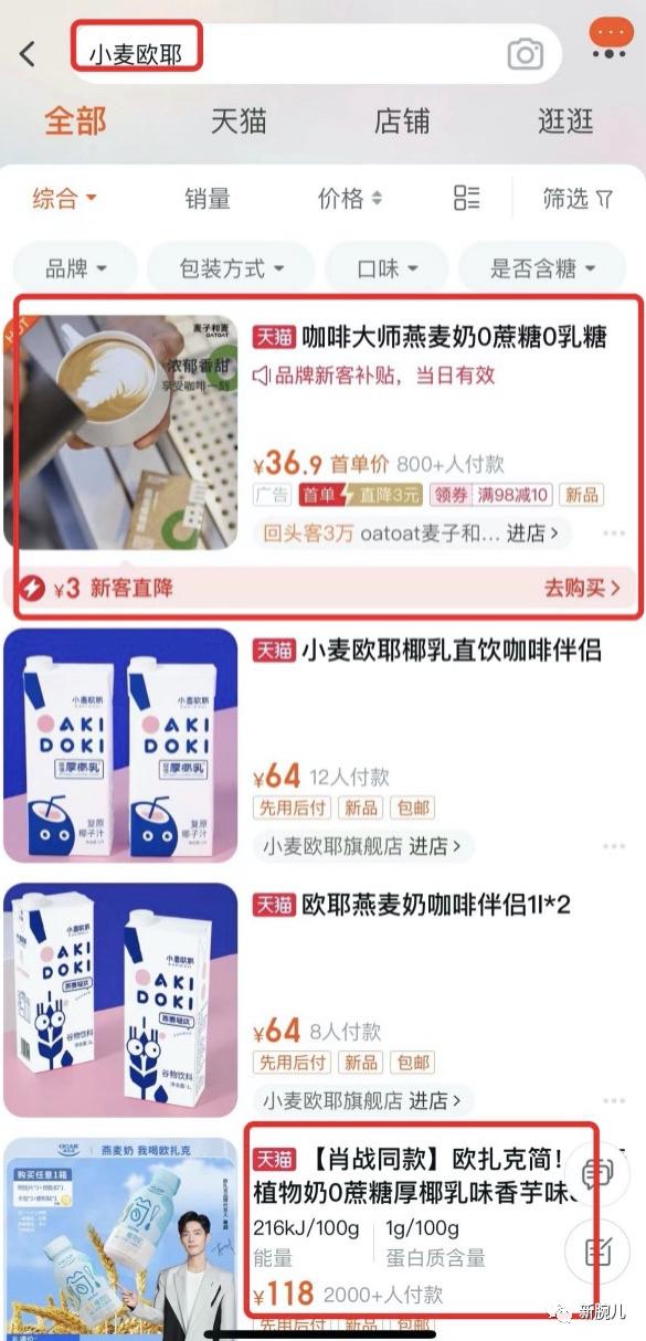 在淘宝上搜索小麦欧耶,最先出现的却是oatoat麦子和麦,第三名出现了欧扎克。