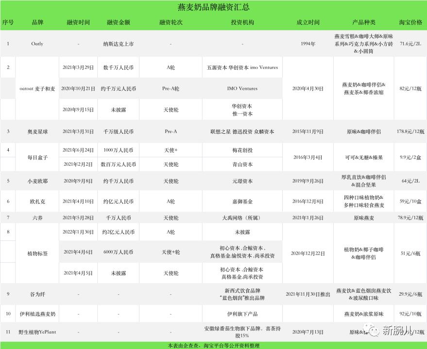 Oatly的上市,不出意外的引来一种跟风者。新腕(ID:bosandao)依据公开资料,整理了10多家燕麦奶新品牌。有大品牌旗下产品,也有新锐品牌,梅花创投、青山资本、嘉御基金等知名机构加入其中,希望自己可以押中下一个“Oatly”。