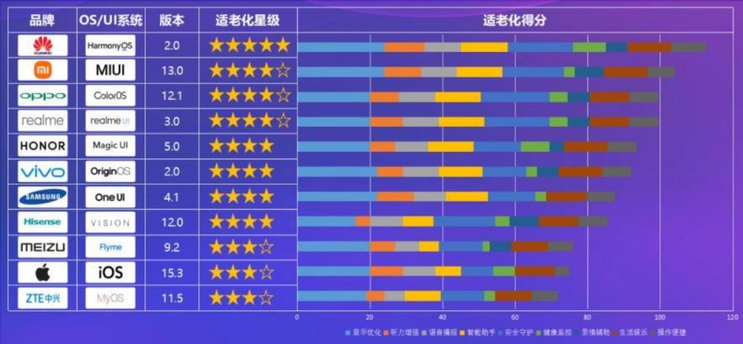根据中国电信发布的《中国电信手机终端适老化指引白皮书 2022版》显示,2022智能手机适老化得分为94.3分(总分120分),同比增长18.4分;适老度为79%,同比提升9个百分点,整体适老化水平提升明显。其中,华为、小米、OPPO的得分最高,排名前三。