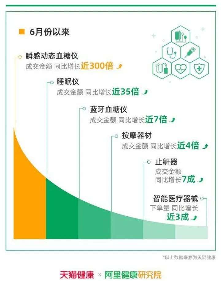 阿里健康研究院公布的数据显示,6月份以来,天猫健康上的睡眠仪成交金额同比增长近35倍;止鼾器成交金额同比增长7成;瞬感动态血糖仪成交金额同比增长近300倍,蓝牙血糖仪成交金额同比增长近7倍。为父母健康买单的子女们,更倾向于购买科技含量高的商品。