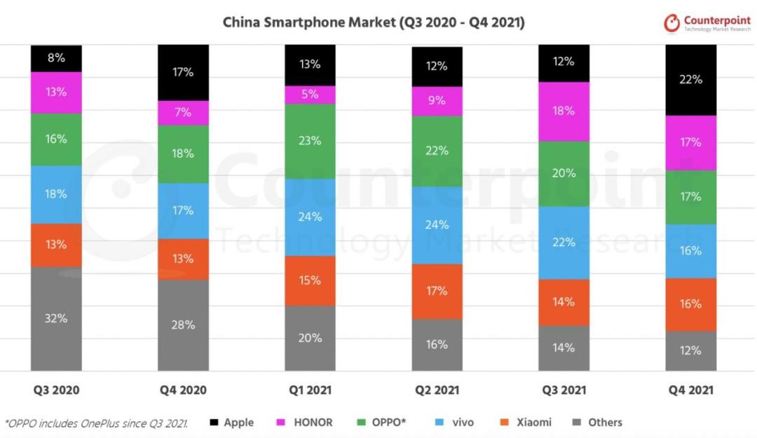 蛰伏了三个季度后,荣耀在去年第三季度缓了过来,迅速重返国内市场。从Counterpoint公布的2020Q3至2021Q4间的六个季度数据可以明显看到,截至去年12月31日,市场份额已经与OPPO不相上下。