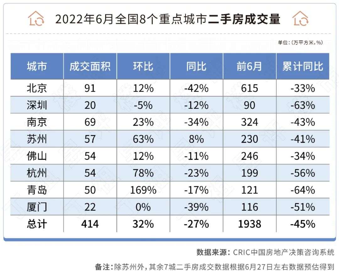 CRIC数据显示,6月8个重点城市二手房共成交414万平方米,环比上涨32%,同比降幅收窄14个百分点至下降27%。受此拉动,上半年8城累计同比降幅较前5月收窄3个百分点至下降45%。
