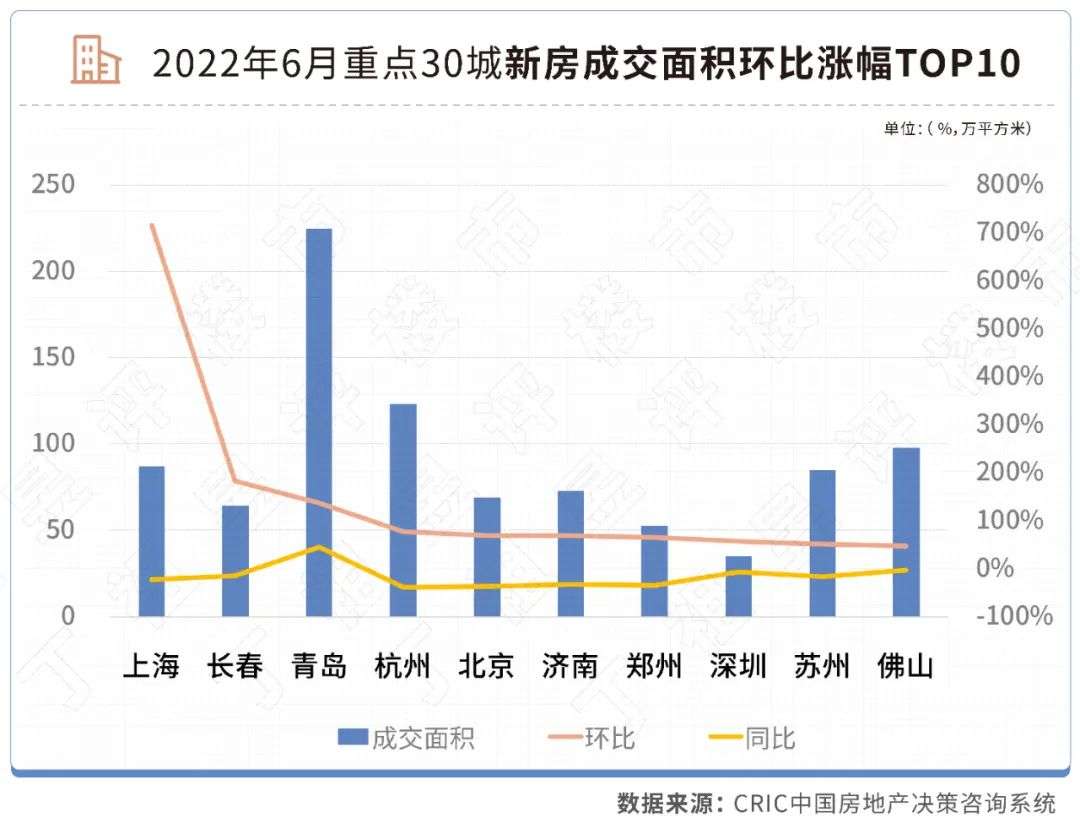 长春、青岛、杭州、济南、郑州、苏州、佛山七个二三线城市,新房成交环比涨幅均位列30城环比涨幅TOP10行列。