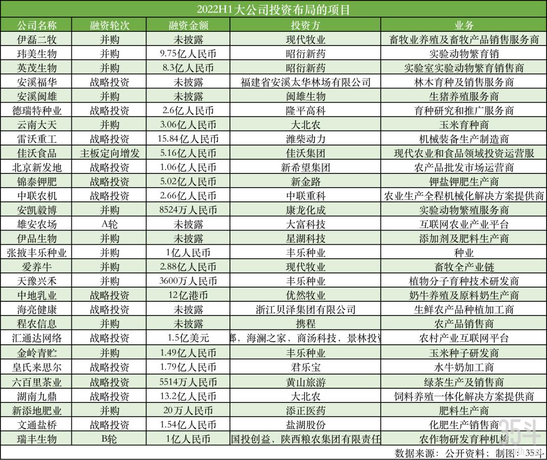 新希望战略投资农产品批发市场运营商北京新发地1.06亿人民币;潍柴动力豪掷15.84亿人民币战略投资机械装备生产制造商雷沃重工。