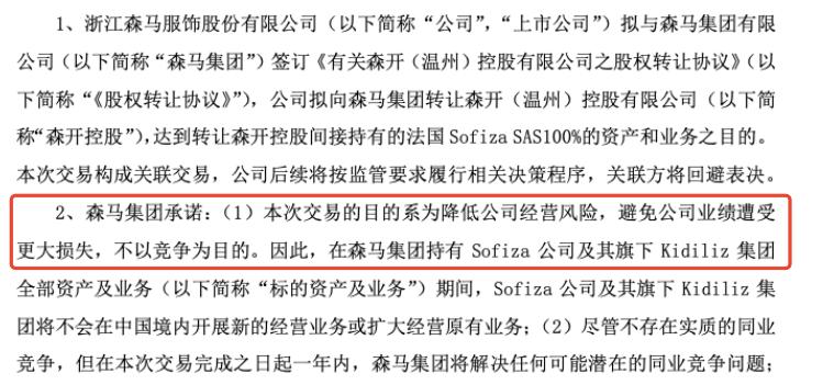 2020年8月,森马服饰与森马集团签订协议,向后者转让子公司森开(温州)控股有限公司及其子公司森马控股(香港)有限公司等共27家公司100%股权,股权处置总价款为6.79亿元,其中包括2018年森马服饰砸重金8.44亿元收购的法国童装集团Kidiliz母公司Sofiza SAS。当时,森马集团就表示,交易的目的系为降低森马服饰经营风险,避免公司业绩遭受更大损失。