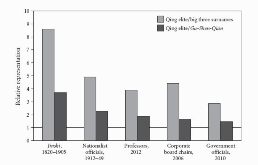 用更精确的数学统计方法来描述就是,这13个姓氏产生的精英,与“张、王、李”这三个大姓(克拉克用这三个姓代表中国平均水平)的平均水平,“相对比例”(relative representation)在3-5之间。在这个方法中,如果相对比例数值大于1,说明这13个姓氏后代的精英比例要比“张、王、李”更高;如果这个数值小于1,说明这13个姓氏后代的精英比例要低于“张、王、李”。