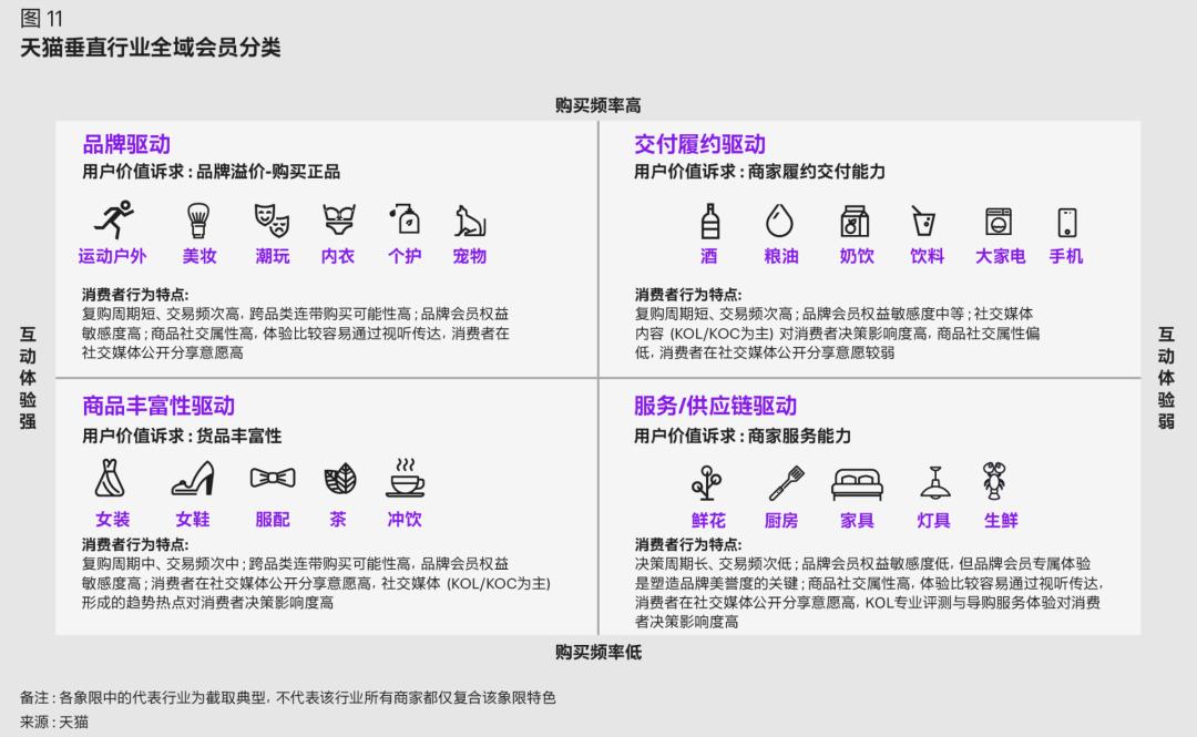 FAST+经营方法论将天猫垂直行业全域会员,按购买频率和互动体验两个维度划分为四个象限,其中运动户外处于购买频率高、互动体验强的象限中,其消费者行为特点呈现出“复购周期短、交易频次高,跨品类购买可能性高,品牌会员权益敏感性高,商品社交属性高,体验比较容易通过试听传达,消费者在社交媒体公开分享意愿高”的特点。