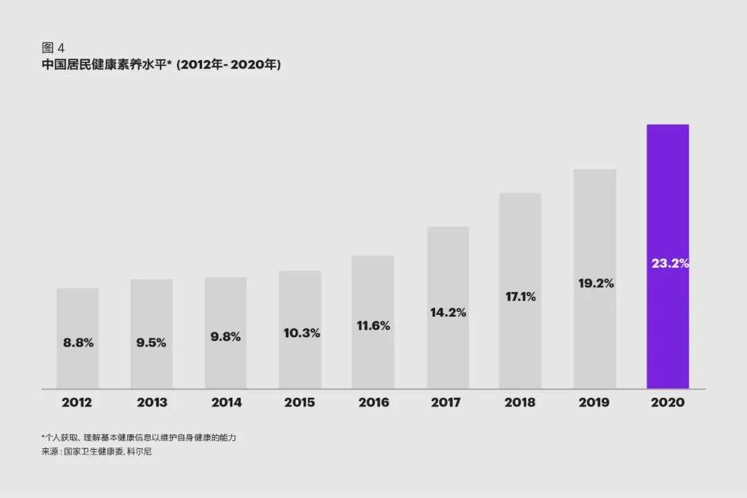 根据近期科尔尼管理咨询公司联合天猫发布的《运动户外私域趋势洞察白皮书》(以下简称《白皮书》)公布的数据显示,2020年我国居民健康素养水平达到23.15%,较2012年提升14.4个百分点,且增长幅度稳步提升。