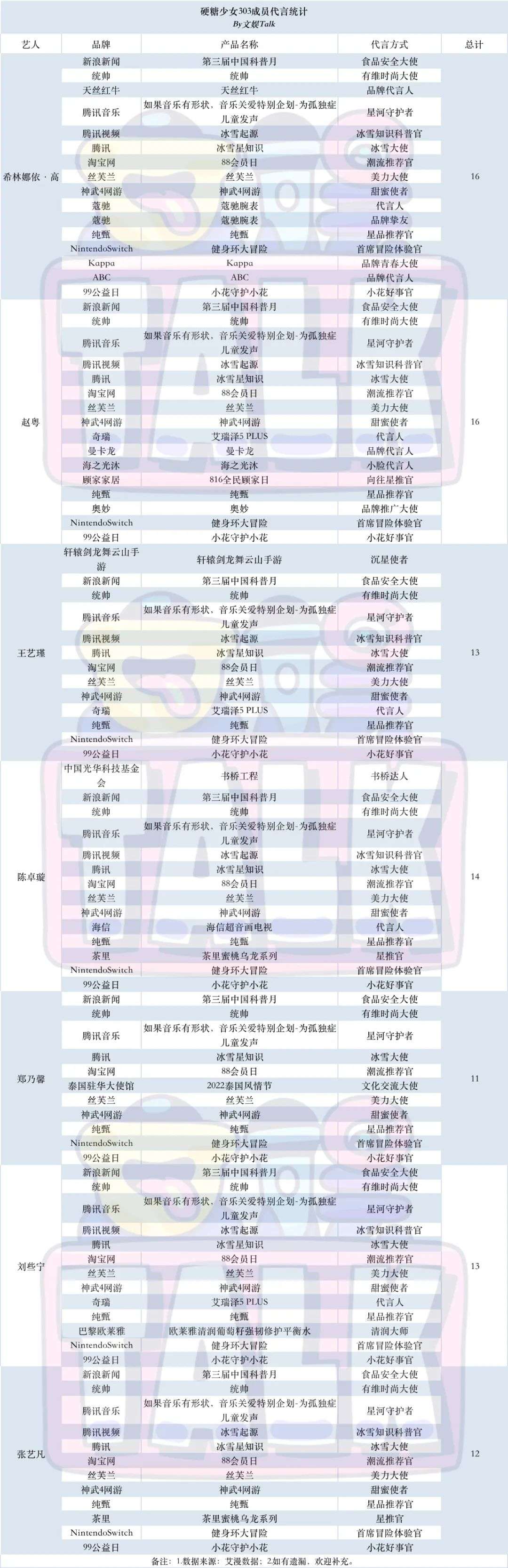 可以看到,除了7个团体推广/代言之外,希林娜依·高、赵粤另外背有9个推广/代言,陈卓璇7个,位居团队第二,王艺瑾、刘些宁6个次之,张艺凡5个,郑乃馨4个最少。