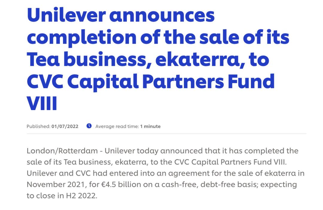 这意味着,包括中国立顿业务在内的多个茶品牌,都已经正式从联合利华中彻底剥离,转而收归“新东家”私募公司CVC旗下,而这一规模庞大的全球茶业务ekaterra也迎来了“新掌门人”。