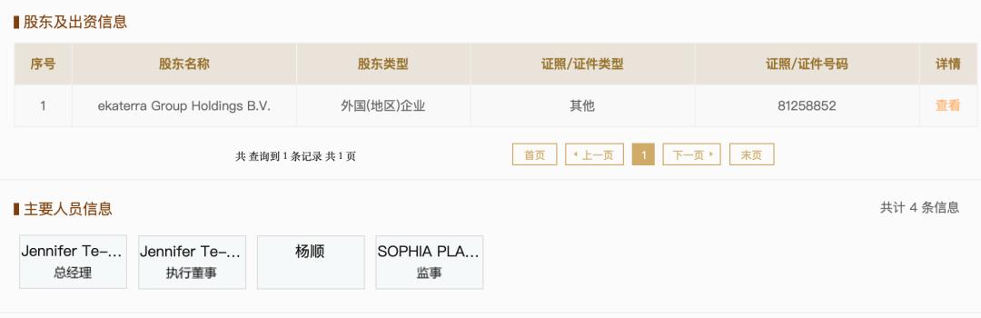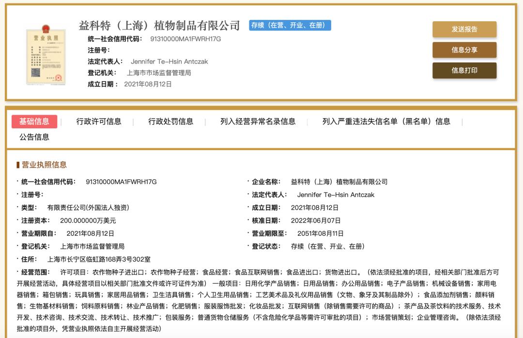 小食代翻查的工商资料显示,益科特(上海)植物制品有限公司成立于2021年8月12日,注册资本为200万美元,核准日期为2022年6月7日,由外资企业ekaterra Group Holdings B.V.持有,经营范围包括农作物种子进出口、农作物种子经营、食品经营、食品互联网销售、食品进出口、货物进出口等。该公司的法定代表人、总经理、执行董事为Jennifer Te-Hsin Antczak。