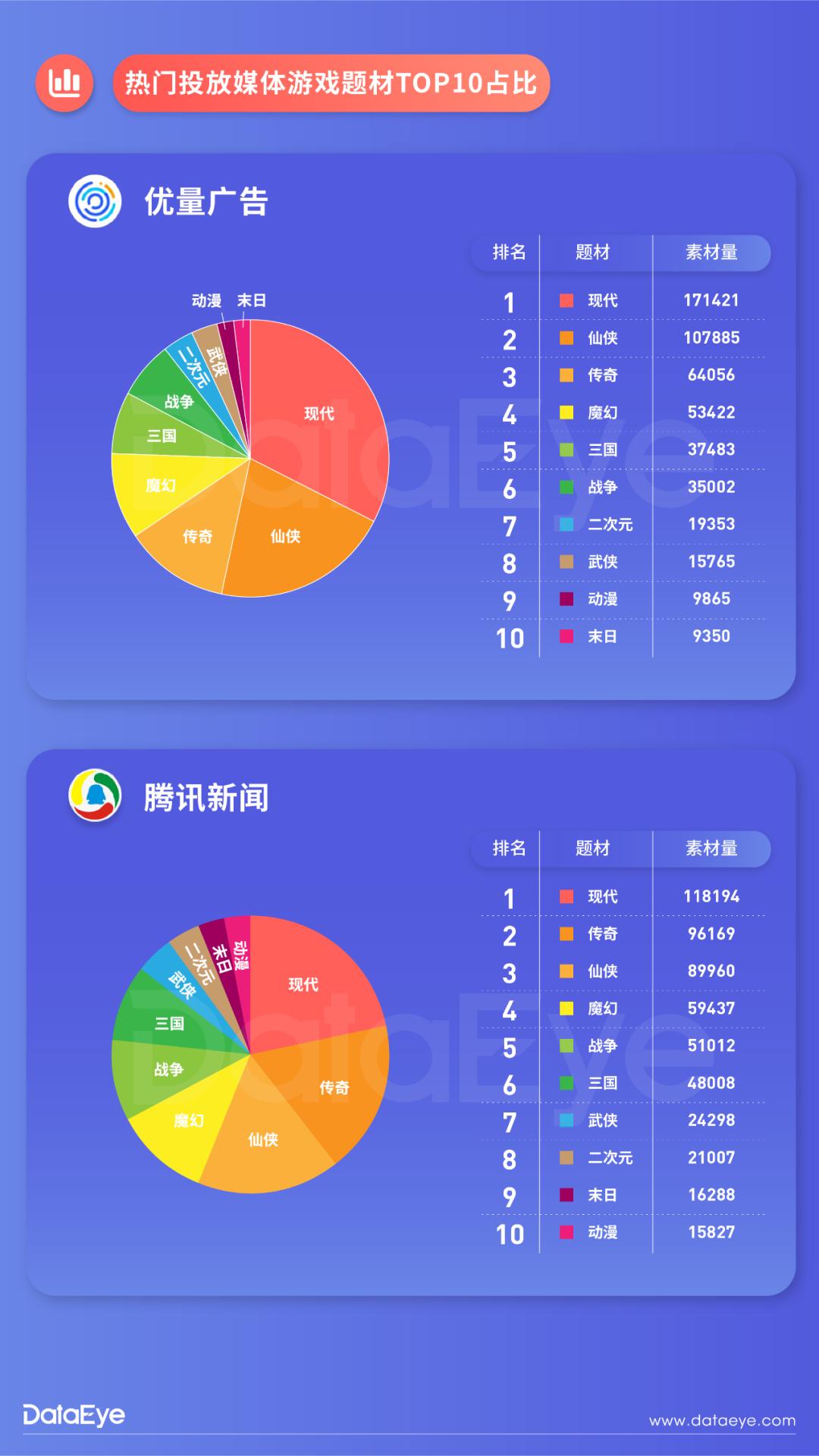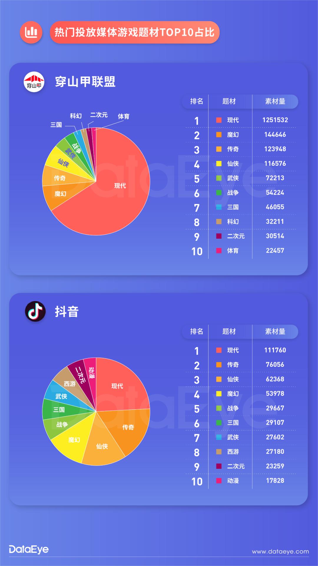 在游戏题材方面,现代题材是国内4个重要投放渠道的占比最高的游戏题材,传奇次之。