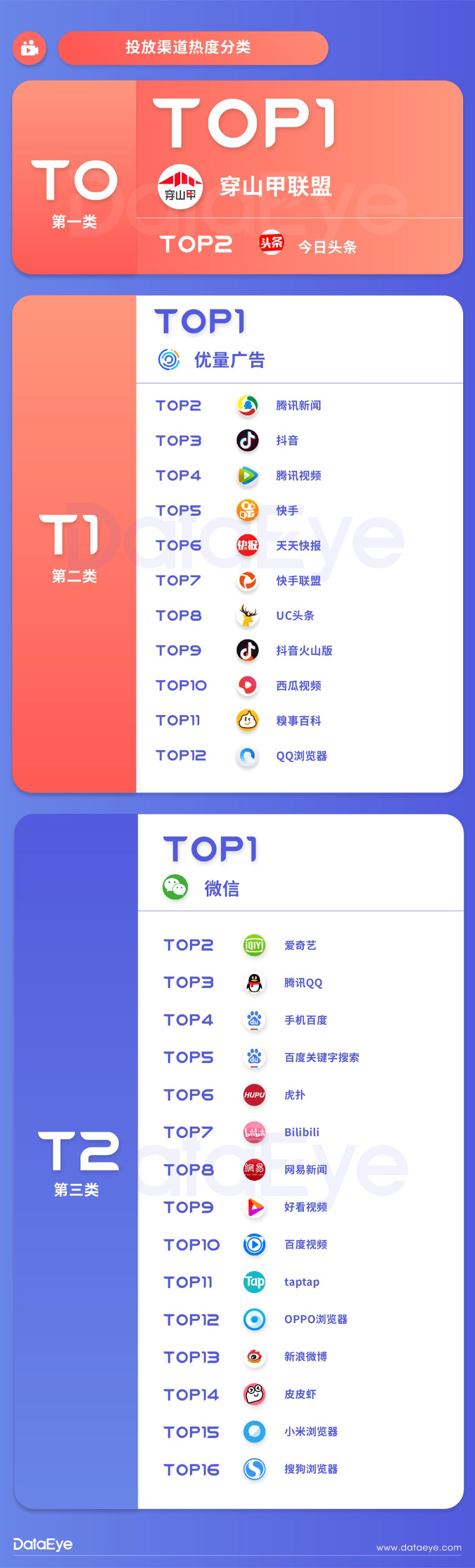 资讯类与短视频类APP仍是主流渠道。2022年字节系渠道继续展现强势的分发能力,其中穿山甲联盟大幅领跑国内各大渠道。腾讯系广告进入2022年后发力,目前腾讯优量广告以及腾讯新闻投放量反超抖音,处于第二梯队领头羊位置。快手渠道投放量下滑,目前排名总榜第7。