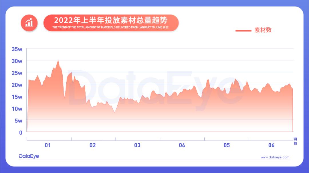 2022年上半年素材投放量整体增加,其中春节档投放量为上半年的顶峰。