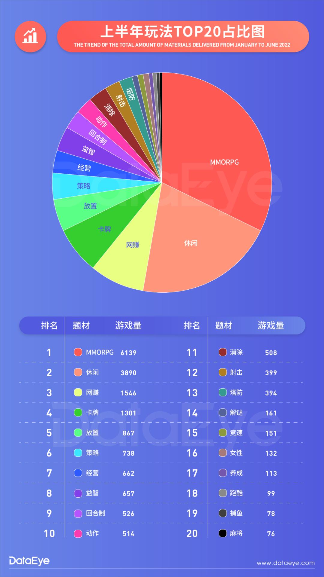 轻度休闲游戏方面,网赚、休闲类依然是绝对的霸主,占据TOP100的60%以上的名额。而捕鱼品类在上半年投放热度较高,有8款产品进入前100。总体来看,2022年上半年的轻度休闲游戏品类向多元化趋势发展。