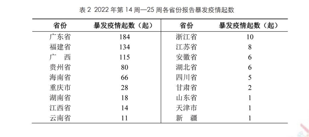 2022 年 4 月 4 日~6 月 26 日,全国报告流感样病例暴发疫情(10 例及以上) 690 起,广东、福建、广西、贵州、海南等几个省份最为严峻,重庆、湖南、江西、云南、浙江等也较高发。