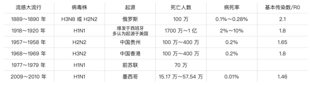 早年没有疫苗,或者预测失败估计错了可能流行的毒株,也就是疫苗没了效果,流感马上又会成为凶神恶煞。历史上有过很多次波及全球的大流行,杀死过很多人。近代以来就有过 6 次致命性全球流感大流行: