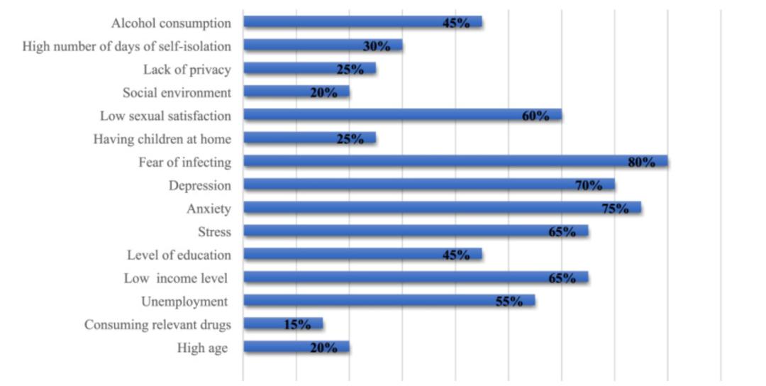 回顾 2022 年以前有关疫情和性生活的研究调查,伊朗学者总结出了以下影响性生活的因素,其中「害怕被感染」、「焦虑」和「抑郁」是最主要的影响因素。