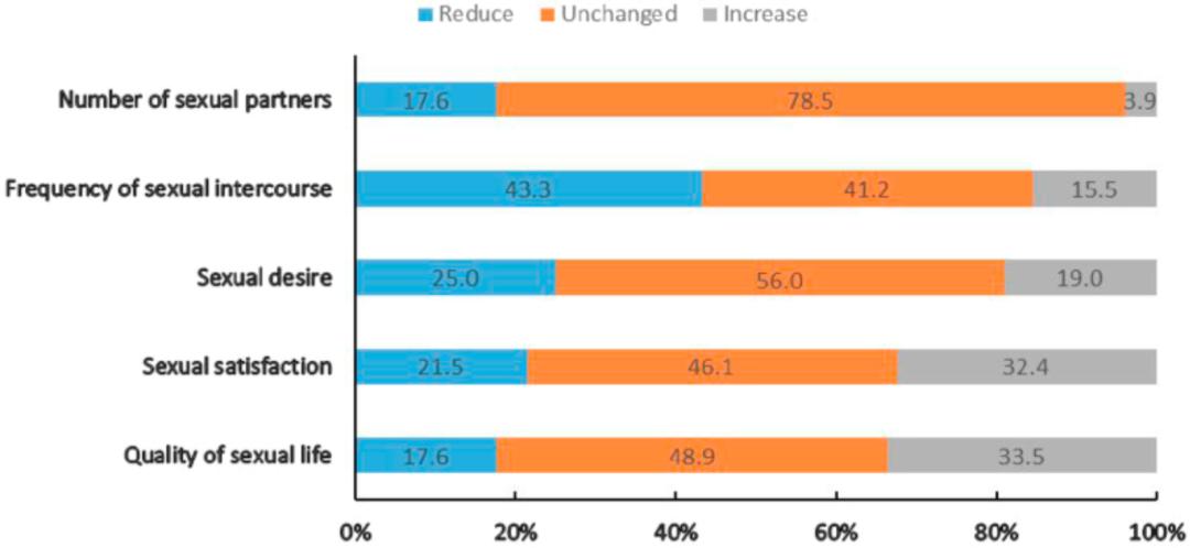 结果显示受访者中出现性伴侣减少、性生活频率下降、性渴望下降、性生活满意度下调以及性生活质量降低的比例分别为 17.6%、43.3%、25.0%、21.5% 和 17.6%。