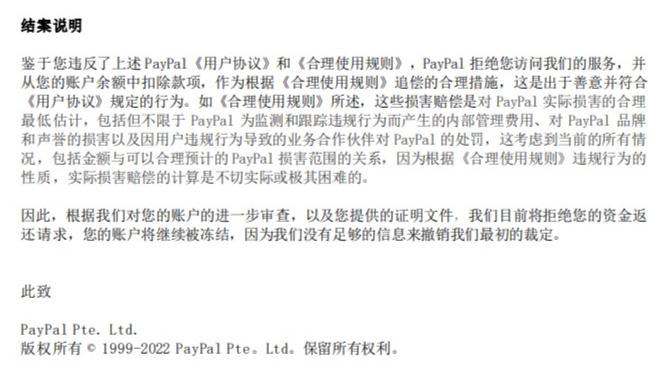 而关于划扣资金的解释,PayPal在发给商家们的邮件中也有提及:“这些损害赔偿是对PayPal实际损害的最低估计,包括但不限于PayPal为监测和跟踪违规行为而产生的内部管理费用、对PayPal 声誉的损害……实际损害赔偿的计算是不切实际或极其困难的。”