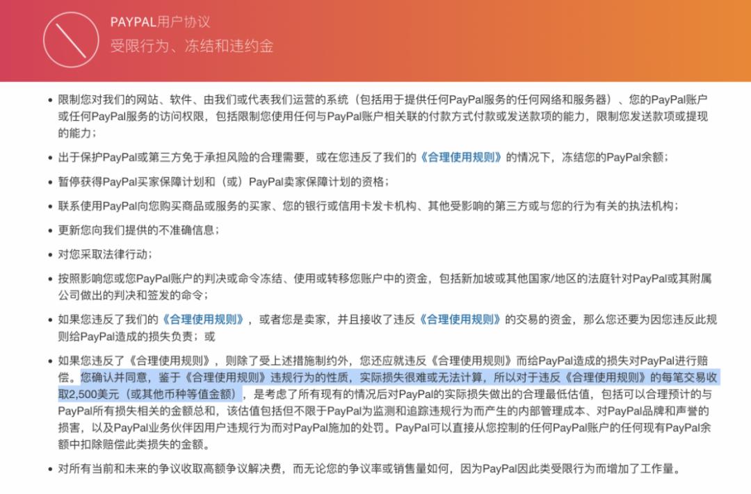多位商家表示,PayPal今年还突然收紧了风控。今年4月更新的商家政策中有一条,“如果违反规则,除受到限制外,实际损失很难或无法计算,将对于违规的每笔交易收取2500美元。”