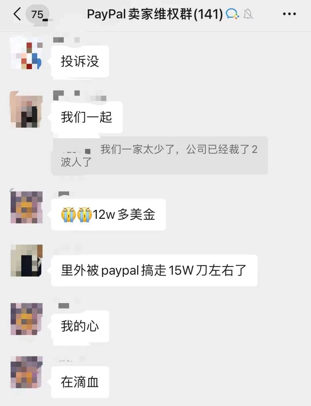 全球最大在线支付平台PayPal(中文名“贝宝”)的维权群每天都有人在入群。群里都是使用PayPal收款的独立站商家。他们的账号在被冻结180天后,本应可以提现的资金却被直接划走,金额少则几万美元,多则数十万美元。