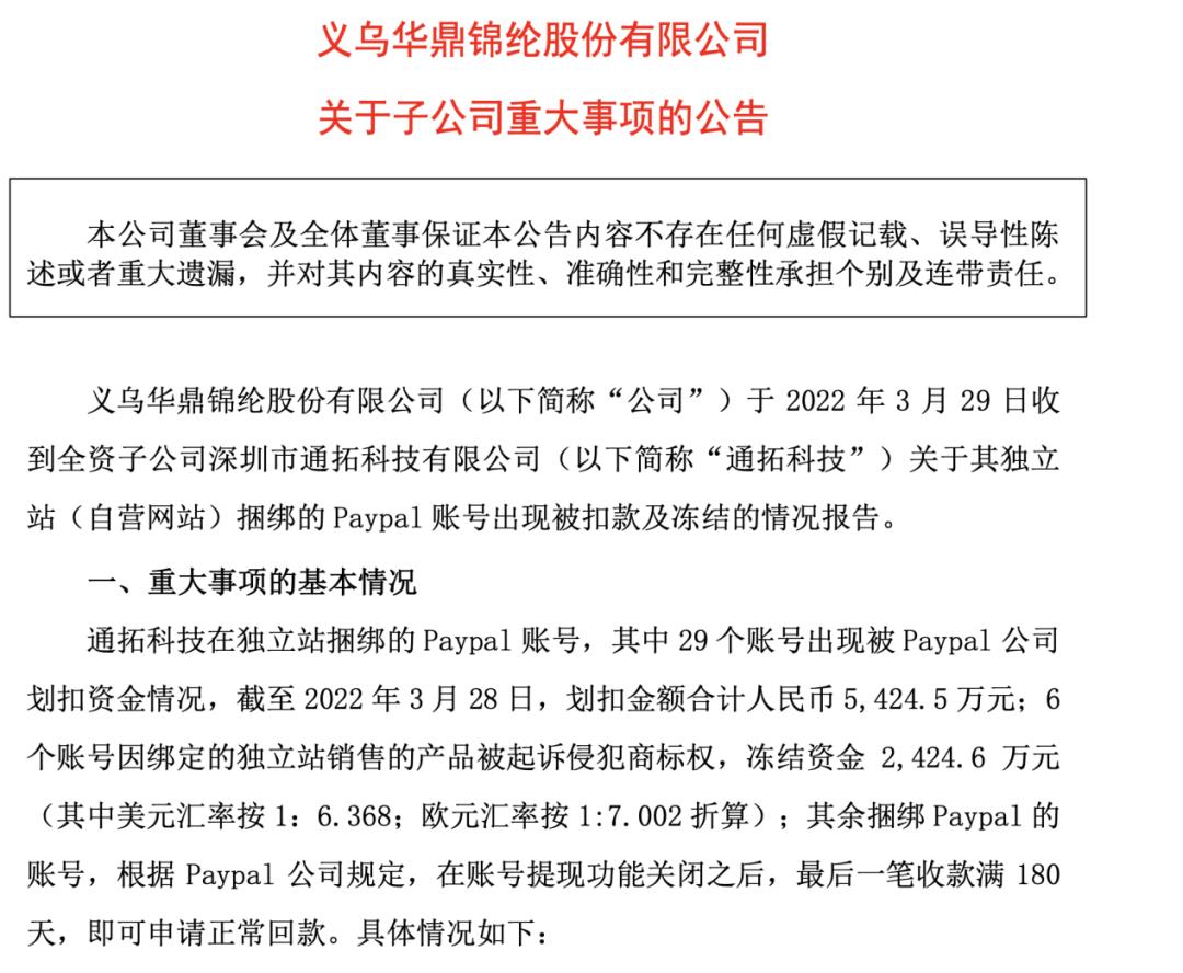 据通拓科技母公司华鼎股份发布公告,通拓科技PayPal账号被划扣及冻结共计7849.1万元,其中包括被划走的5424.5万元,被冻结资金2424.5万元。