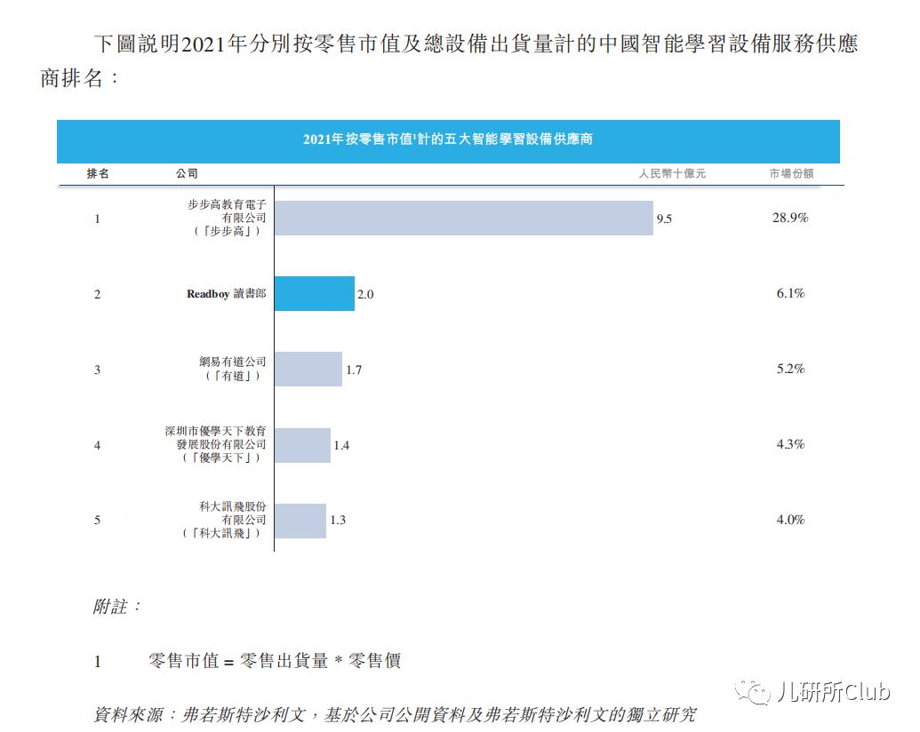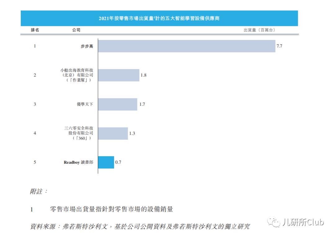 根据弗若斯特沙利文报告,于2021年,按总零售市值计,读书郎在中国的智能学习设备服务供应商中排名第二,而按总设备出货量,读书郎在中国的智能学习设备服务供应商排名第五。