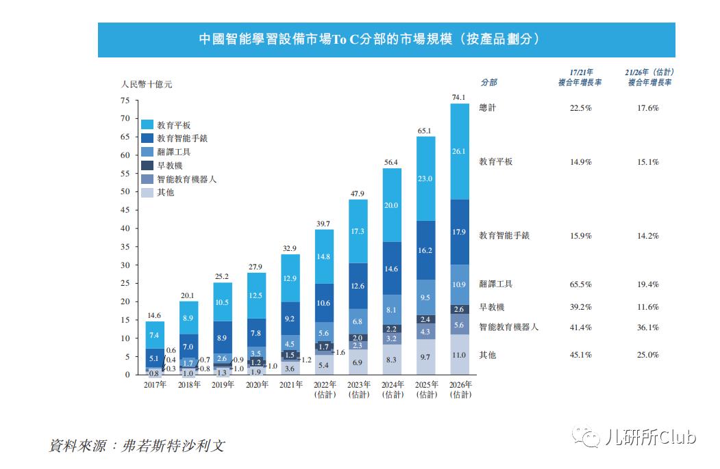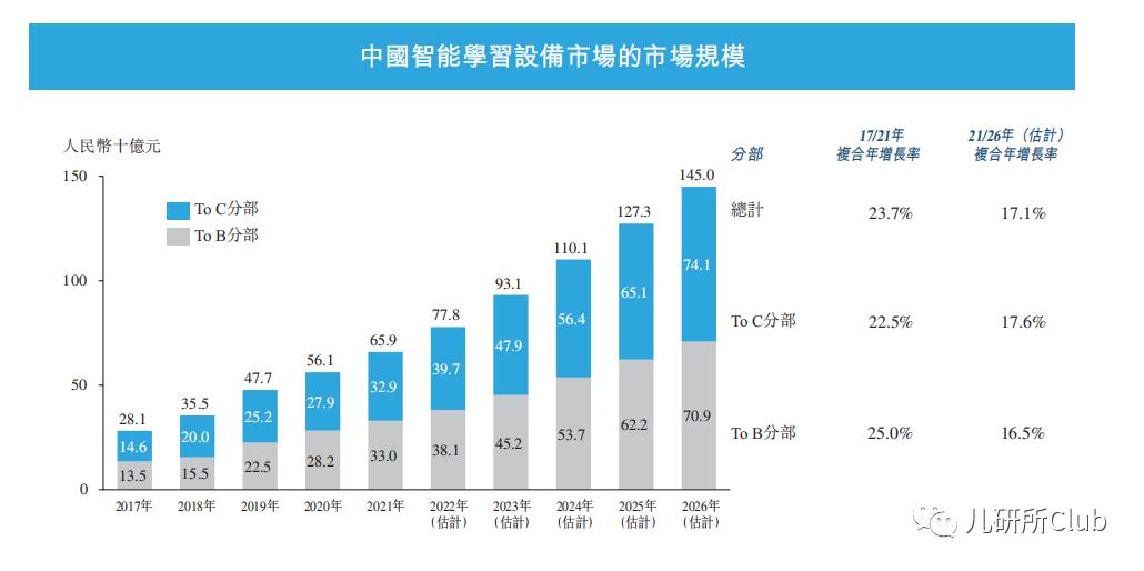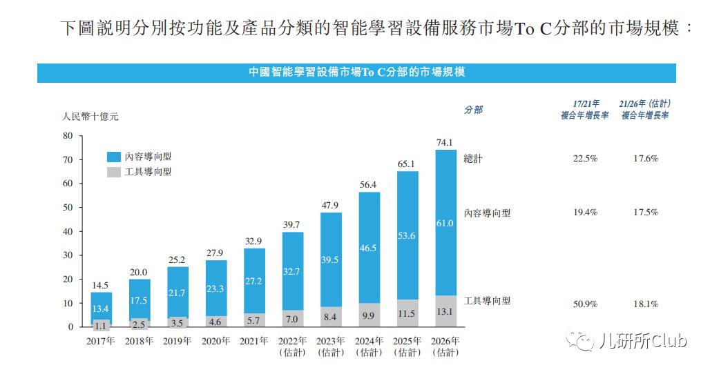 根据相关报告,2026年,中国智能学习设备的总市场规模将为1450亿元,2021年至2026年的复合年增长率为17.1%,于2026年,To C分部的市场规模预计为741亿元,复合年增长率为17.6%。其中To C部分中,内容导向型占据了大多数。