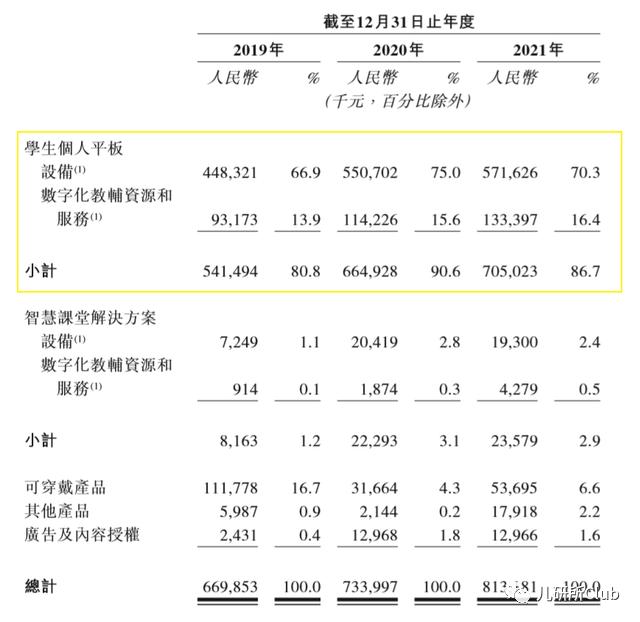 除了利润降低,读书郎学习平板业务在整体业务占比也居高不下。根据招股书,在读书郎主要业务学生个人平板、智慧课堂解决方案、可穿戴产品和一些智能配件中,于往绩记录期间,学生个人平板是公司主要产品类别,于2019年、2020年及2021年占总收入的80.8%、90.6%及86.7%。