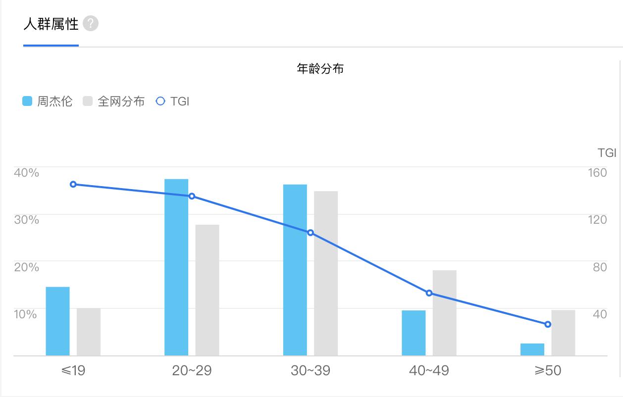 同时,虽然 19 岁以下的人群因其网民基数少而所贡献的比重较少,但却拥有最高的 TGI 指数,这代表未成年人对周杰伦的关注程度远高于整体水平。