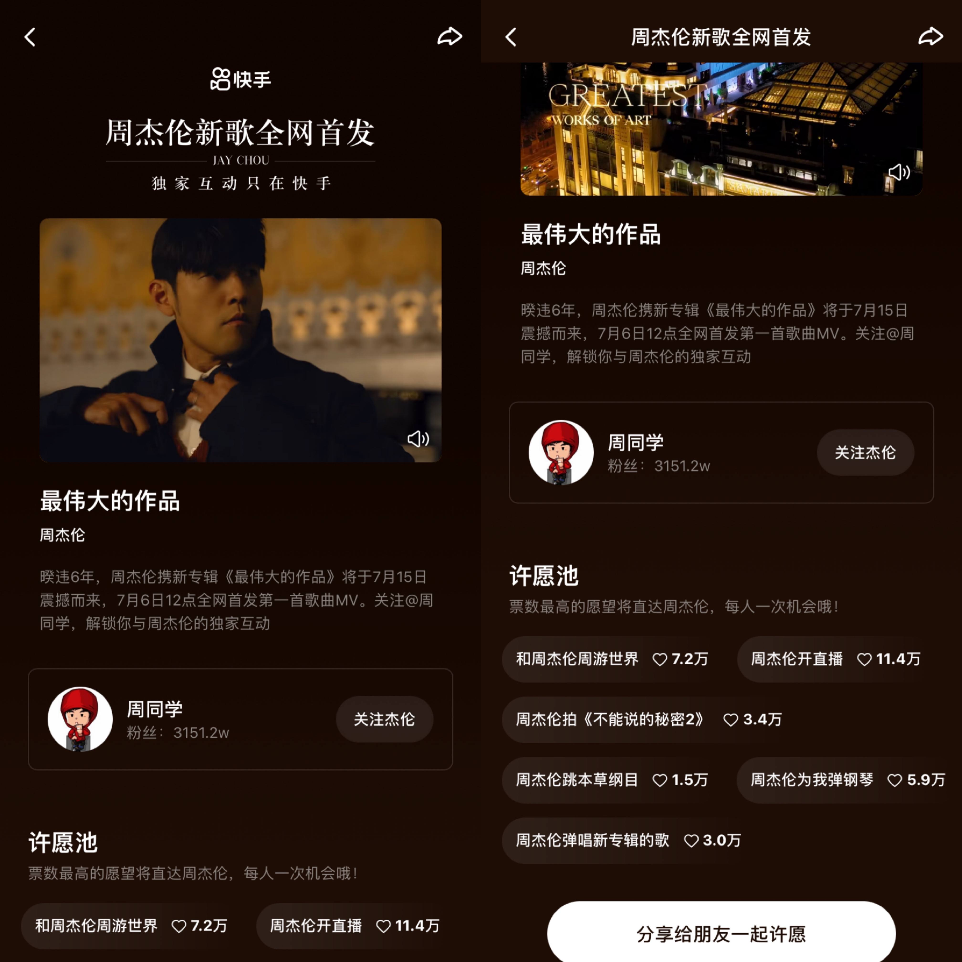 从 7 月 1 日周杰伦预告新歌发布日期以来,各家平台就在紧锣密鼓地为即将到来的流量热潮修筑水库。除了开屏界面整幅推荐这种“基础操作”,TME 还推出了新专辑定制周边,B 站开辟了首页专属入口并设计了周杰伦专属表情和弹幕,快手则开展了“向周杰伦许愿”等互动企划。