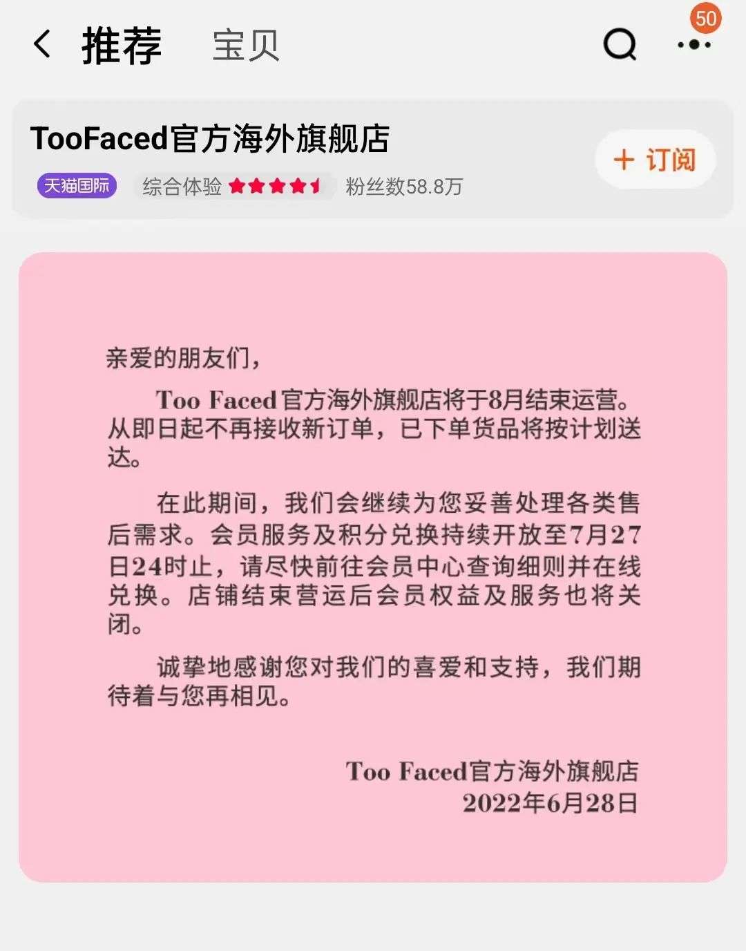 背靠大树也不一定好乘凉。雅诗兰黛旗下彩妆品牌Too Faced天猫海外旗舰店日前发布公告称,将于8月结束运营,店内产品已全部清空。