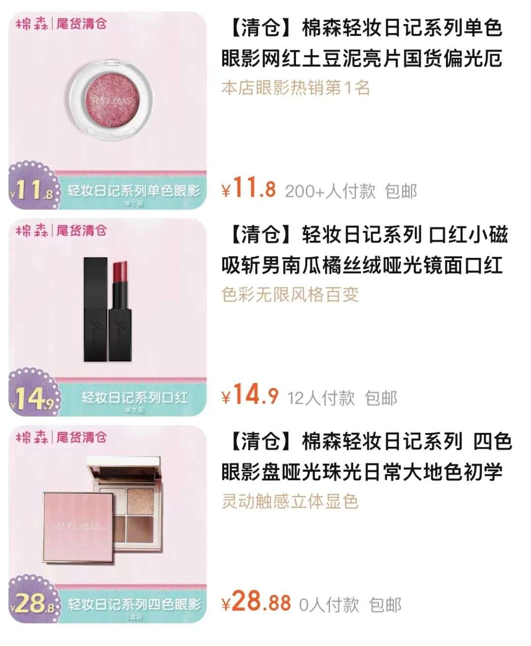 中国化妆棉龙头企业棉森也逃不过同样的命运。其2019年创立的自有美妆品牌“轻妆日记”,目前仅剩三款相关产品在棉森旗舰店内销售,均已挂上“清仓”字样。
