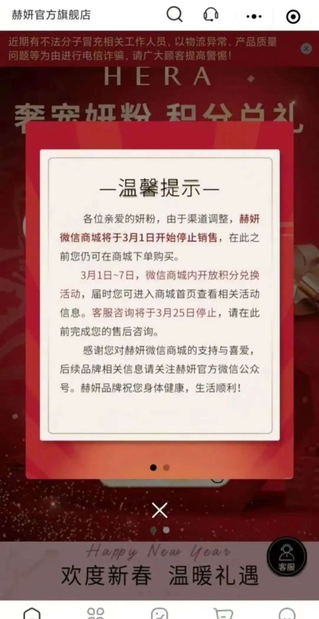 2月,HERA赫妍宣布,已经关闭所有中国市场线下专柜,微信商城也即将关停。中国消费者仅能通过品牌天猫官方旗舰店进行购买相关产品。