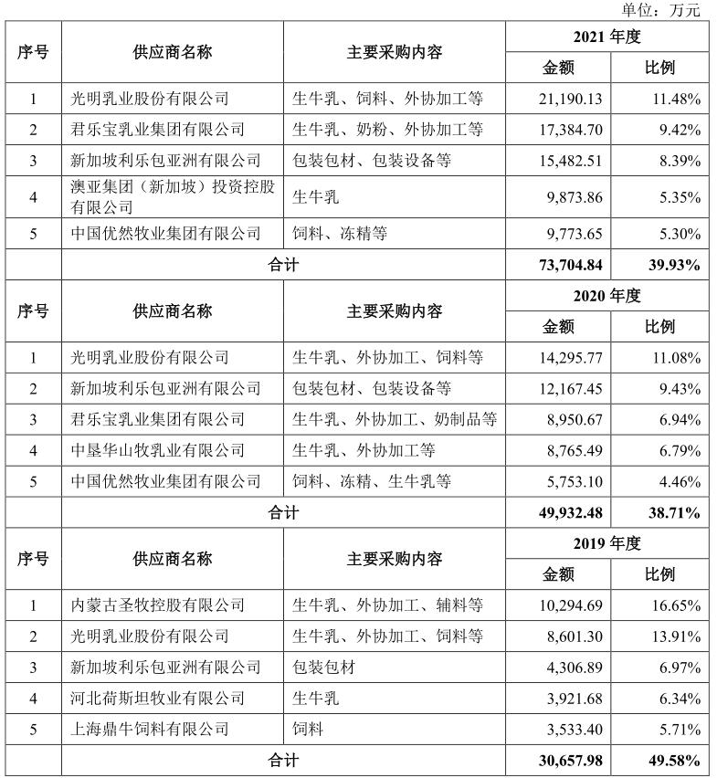 从近年的对外采购情况来看,光明乳业一直是认养一头牛的最大供应商,2021年对其采购规模占比达到11.48%。第二大供应商则是君乐宝。