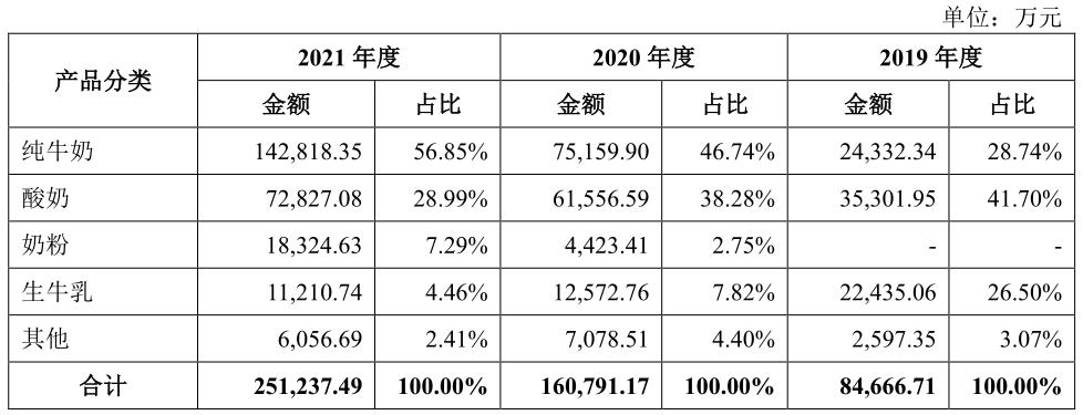 围绕常温奶,认养一头牛接连推出纯牛奶、酸奶、奶粉等乳制品以及生牛乳。2019年,乳制品的销售收入为8.47亿元,2020年达到16.1亿元,翻了将近一倍。到2021年,乳制品带来的收入超过25亿元。