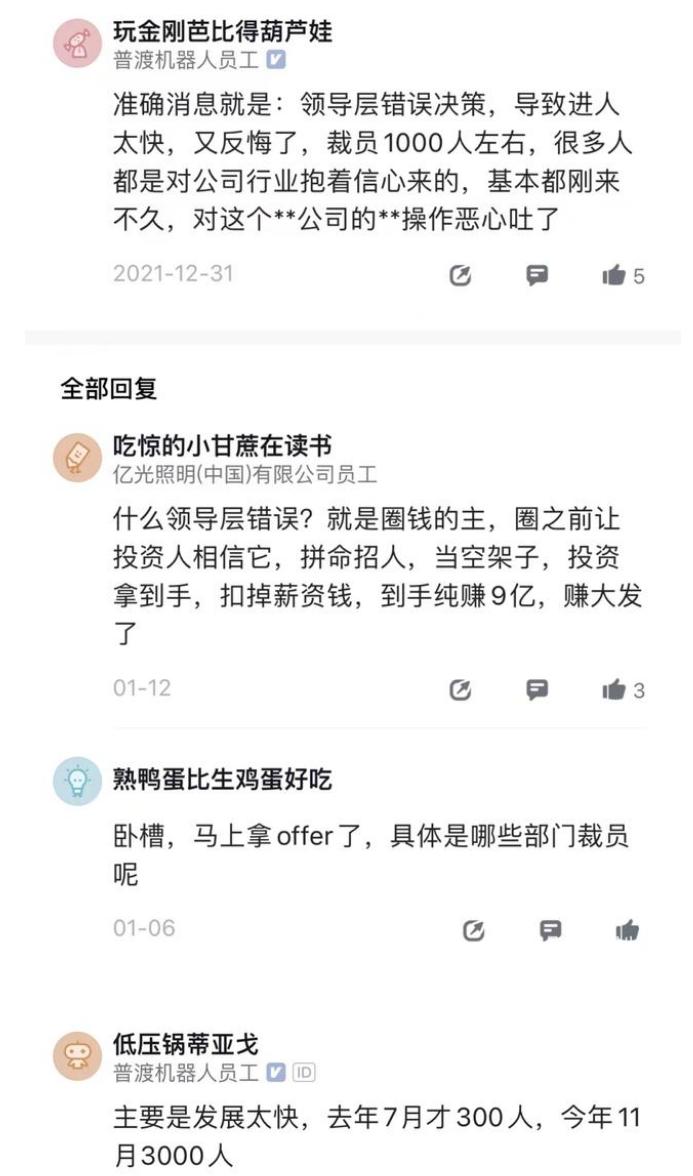 2021年12月,某职言平台上就已经出现普渡机器人裁员的相关话题,普渡被曝出“批量裁员”、“毁约应届生”等现象。