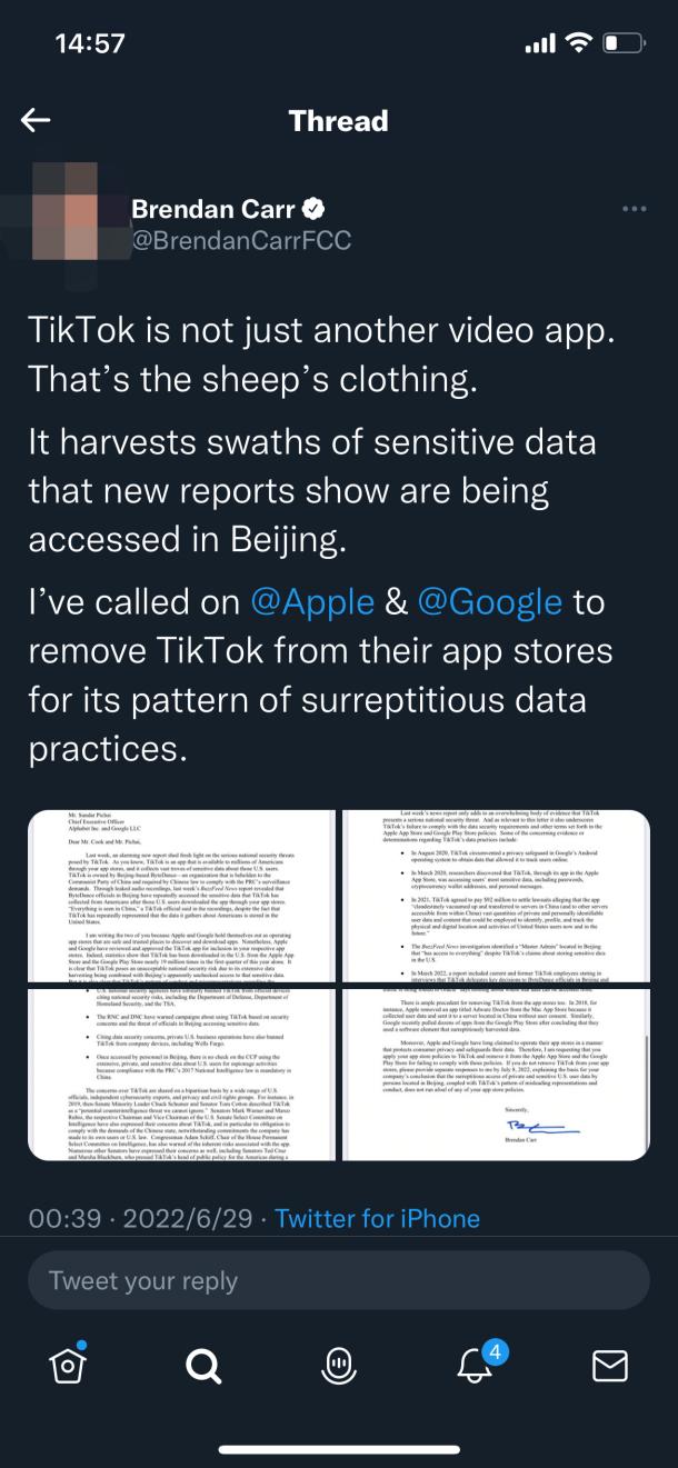 根据外网的信息,6 月 26 日,美国 FCC(美国联邦通讯委员会)专员 Brendan Carr 分别致函苹果和谷歌 CEO,要求 2 家公司从 App Store 和 Google Play 中下架 TikTok,理由倒是不新鲜,该专员认为 TikTok 收集了大量美国用户的敏感数据,且字节在国内可以访问这些数据,这对美国国家安全构成了威胁。