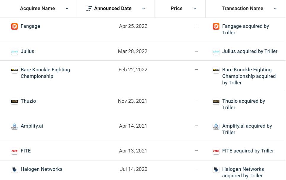 Triller 从 2020 年以来,完成了多项收购,除了 FITE 这样的流媒体平台,还有一些 toB 的服务。例如 2021 年 11 月收购的体育活动及创作者节目策划平台 Thuzio、2021 年 12 月收购的对话商务服务商 Amplify.ai。进入 2022 年,Triller 又收购了创作者营销平台 Julius 以及创作者粉丝管理平台 Fangage。